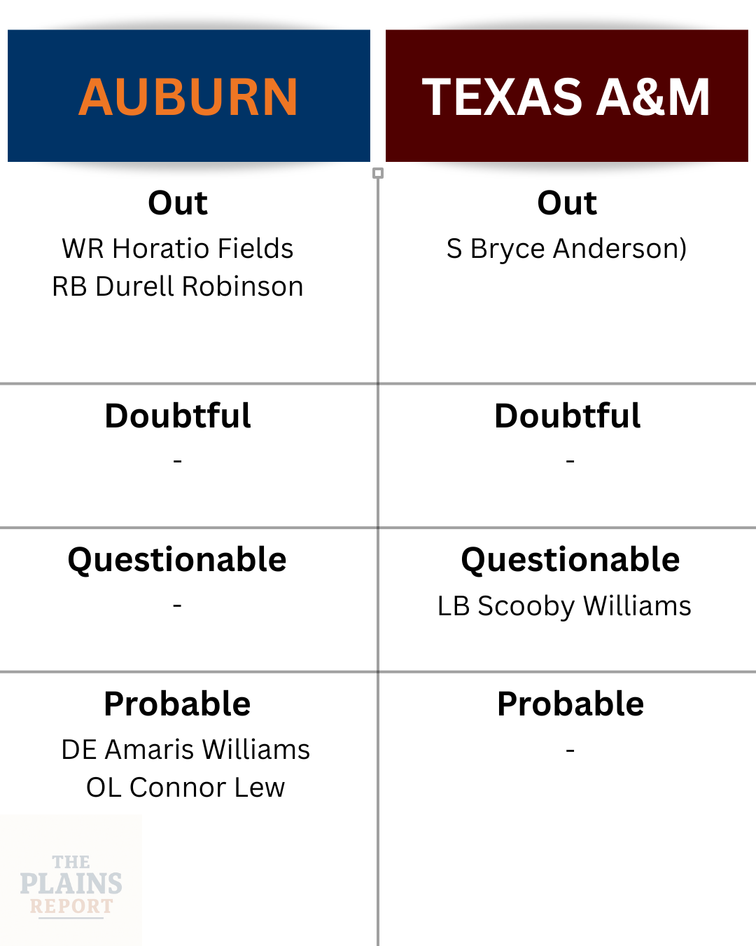 Auburn hits the road to face No. 9 Texas A&M in a pivotal SEC showdown. Key matchups, injury updates, and predictions highlight what to watch this weekend.