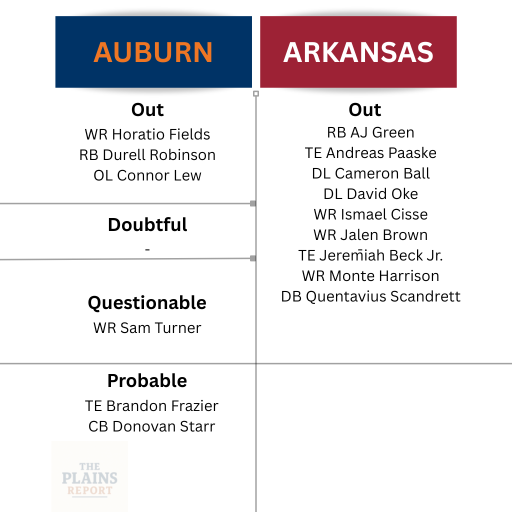 Auburn catches a break with Connor Lew out, as Arkansas’ defensive line is already thin. Their top defender, Cam Ball, will also miss the game. Freeze plans to move right tackle Mason Murphy, who has never played center, into the role, along with 17-year-old true freshman Kail Ellis, who struggled with high snaps against Missouri.